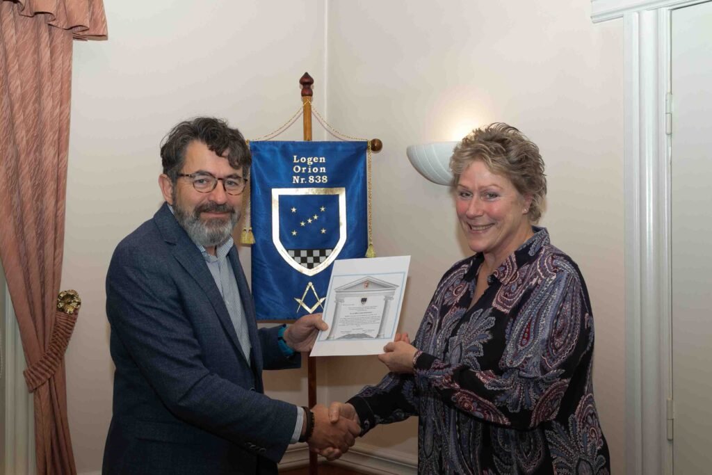 Logen Orion har tradition for ved forskellige lejligheder at uddele donationer. Logens brødre har i sin tid vedtaget, at logens indsamlede midler skal gives til lokale formål – og her til samfundets svageste. Logen har ned velvillig hjælp fra Laugets Velgørenhedskasse haft mulighed for at uddele en donation på 15.000 kr. til Krisecenteret Gaia, som gør et fantastisk og vigtigt stykke arbejde for udsatte kvinder og deres børn. Regina fra Krisecentret kom og fortalte om dagligdagen hos Gaia, og hvordan donationen varmede i denne juletid. Logens ærværdige mester Jørn V. Kristensen overrakte ved dette besøg donationsbeviset.